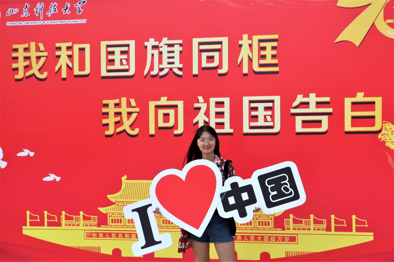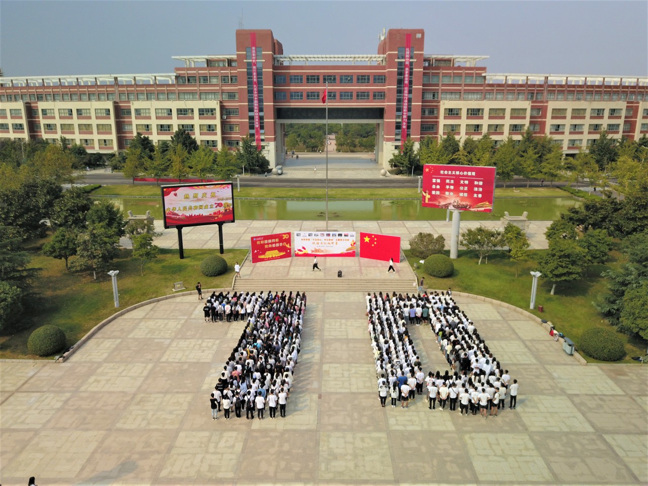 泰山广场下,同学们精神饱满、英姿飒爽、庄严肃穆,在院员工会主席范晓萱的带领下重温了入团誓词,在国旗辉映之下,仪态更显端庄,透出一片炽热的爱国赤诚。艺院学子排出“70”的字样,为祖国70岁的生日献礼。随后,研究生李晓桐和工设16-2班崔健两名员工在国旗下深情的朗诵了《中华颂》:“七十年翻天地覆,七十年国富民强。未来,还有更多的七十年,让我们放飞梦想,全面深化改革,为实现中华民族的伟大复兴而奋斗。”最后,同学们站在五星红旗的展板前合影留念,表达对祖国七十周年华诞的美好祝愿。