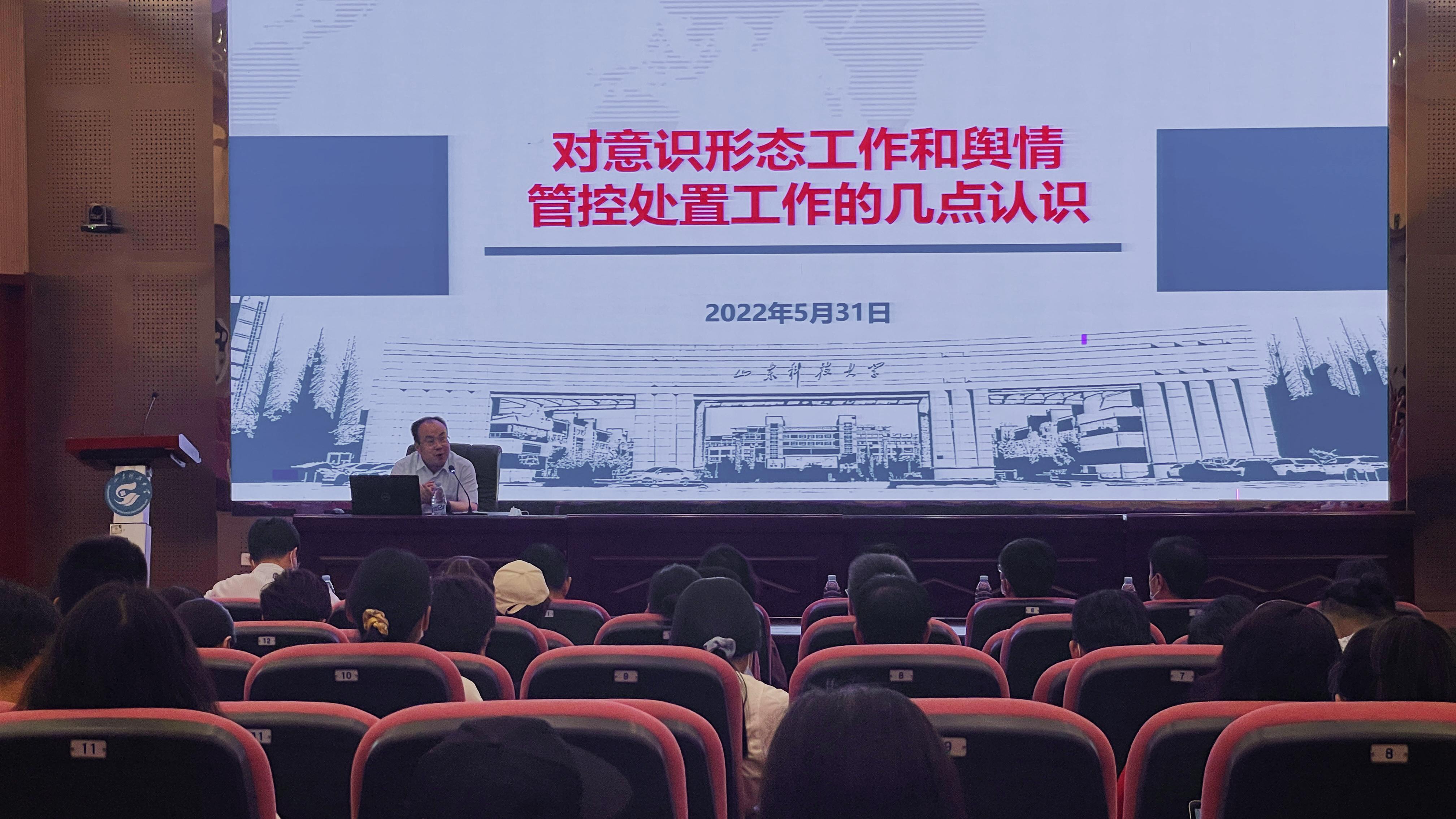 5月31日下午,公司党委举办专题宣讲报告会,公司党委常委、宣传部部长、教师工作部部长李克周为学院教职工做意识形态工作和舆情管控处置工作专题宣讲报告。学院班子成员、理论学习中心组成员及教职工参加了报告会,公司党委书记王凯主持报告会。