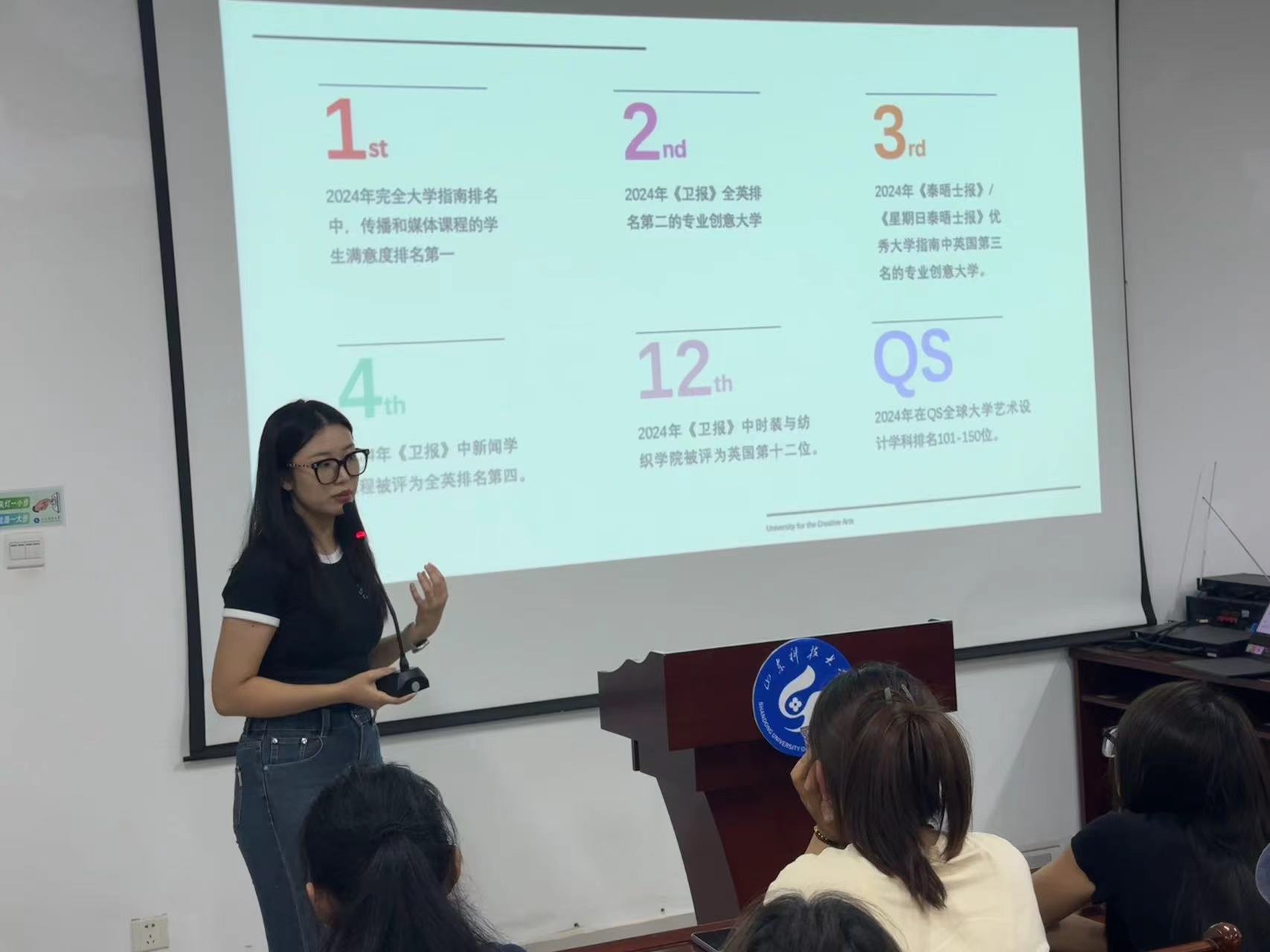 介绍会上,作为UCA“大学姐”的赵老师详细介绍了英国的教育体系、UCA的院校特色及专业优势。赵老师取得UCA本硕学历、毕业后在UCA留校工作,她向现场同学们分享了自己的留学经历和收获,生动讲述了在异国他乡的学习、生活故事,重点介绍了留学对个人成长和职业发展带来的积极影响。这些经历让现场同学们感受到了留学的魅力,也为他们的留学规划提供了有益的参考。